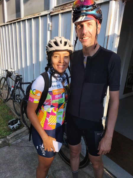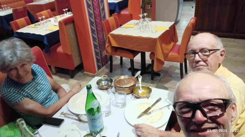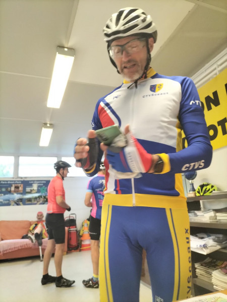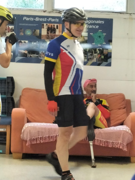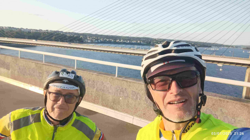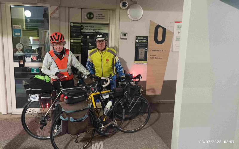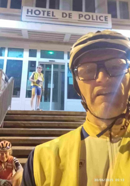 Il est en effet 3 heures lorsque nous nous levons. Avec un code, récupéré difficilement hier soir par Pierre qui, malgré la fatigue, a pu résoudre le problème de réservation à ce « B and B », on peut entrer dans le hall pour boire un café tiré d’un distributeur, en mangeant divers biscuits « tirés du sac ». On descend les vélos du second étage, et c’est reparti à l’heure prévue : 4h ! Pierre nous guide sur un parcours aussi labyrinthique qu’hier soir, afin de sortir de l’agglomération de Saint-Nazaire. Dans la nuit, on réussit, dans la platitude de la Brière, à maintenir la moyenne prévue. J’ai reçu un SMS de Dominique Pelletreau, nouveau sariste breton. On avait déjà correspondu hier, mais vu notre arrivée tardive au pont du Mindin, il n’avait pas pu nous y attendre ! Maintenant, il s’est placé à un autre passage obligé, le pont après La Roche-Bernard, où on arrive vers 5h50, avec quelques minutes de retard. Dominique est en cuissard et maillot court, malgré une température qu’on juge très fraiche (11-12°). On lui fait signer nos carnets de route. Il nous suit jusqu’à Elven, sur 36 km, où on a prévu une pause-café de 30 mn, puis, avant notre départ, il nous prend en photo, laquelle sera placée sur le site de l’ADF. S’ensuivent 50 kilomètres très difficiles, sur des routes parsemées de côtes, notamment dans le contournement de Plumelec. Très fatigué par les huit jours précédents et le manque de sommeil, je me traîne dans ces bosses. Sylvie les monte elle-aussi de plus en plus difficilement avec ses deux vitesses. Plus grave, sa tendance, déjà contrariante hier, de pencher sur la droite, s’amplifie. Le risque d’une nouvelle chute est évident. Il s’agit du phénomène dit « de la tour de Pise », bien connu des cyclos adeptes de la longue distance, avec des exemples célèbres : Jean sur PBP, Jean-Claude C. sur un BRM de 1000, Alain C sur plusieurs épreuves, et même l’ami Bernard, notre second sariste d’avant-hier. L’abandon est hélas quasiment obligé dans ce genre de situation, d’autant que le problème du câble de dérailleur amplifie les difficultés. C’est ce que décide Sylvie à notre arrêt contrôle/repas de Saint-Nicolas des Eaux, village très touristique de la vallée du Blavet. La responsable de l’office du tourisme décale aimablement son horaire de fermeture (13h) pour rechercher un moyen de « rapatriement ». Ce sera finalement en taxi que Sylvie rejoindra Brest. On repart, Pierre et moi, vers 13h20, avec 2h20 de retard sur l’horaire prévu, très tristes que Sylvie, après 1900 km depuis Paris, doive abandonner à 150 km du but et ne pas valider une 11eme diagonale. On se relaie assez bien, au début, mais, après Guémené-sur-Scorff, les côtes longues et difficiles viennent casser ce bon rythme. On « tourne » à 17-18 km/h de moyenne roulée au lieu des 19 ou 20 prévus. Heureusement, on avance à nouveau mieux après Rostrenen, sur les routes empruntées sur PBP, un peu plus roulantes dans ce secteur, et, surtout, il nous restait 1h20 de temps de pause, en trois arrêts programmés, qu’on parviendra à supprimer ou à limiter, gagnant ainsi une bonne heure de marge. Ce ne sera pas inutile : passablement fatigué, je retarde notre progression dans les côtes entre Carhaix et le Roc-Trevezel. Heureusement aussi que la température reste idéale et que le vent du NNE a tourné au NEE ! A Sizun, la boulangerie où on pointe habituellement nos cartes, est fermée à cette heure ! Je vais à l’« hôtel des Voyageurs », où j’ai dormi lors des PBP 2019 (seul) et 2023 (avec Jean et Sylvie), où le patron appose son tampon, en évoquant les PBP ! Il nous reste 37 km et une petite marge de sécurité reconstituée… mais bientôt entamée, car je crève une seconde fois à l’avant, du fait d’un silex. Pas le temps de se lancer dans la recherche de son éventuelle présence dans le pneu (neuf, comme l’arrière… il y a 2000 km !) : avec l’aide de Pierre, je mets le pneu de rechange et on a vite réparé (pas besoin de vider le chargement des sacoches arrière cette fois !). On prend l’ancienne route de PBP (des éditions 1995 à 2019) par Loperhet et le fameux pont Albert Loupe. Il y a moins de joie aujourd’hui qu’il y a treize ans, lorsque nous étions arrivés de Menton, avec Sylvie et Pierre. La montée sur Brest me semble interminable. Enfin, c’est l’hôtel de police : il est presque 22h, même s’il fait bien jour si loin vers l’ouest une semaine après le solstice. On n’avait plus qu’une trentaine de minutes de marge avant l’expiration des délais. On retrouve Sylvie, arrivée depuis longtemps à l’hôtel Saint-Louis, à proximité du commissariat. Elle nous a attendus pour aller dîner derrière l’hôtel, dans un des rares établissements encore ouvert ce jeudi soir, un restaurant indien (« le Tripura »), qui nous sert des plats de bonne facture.