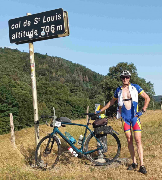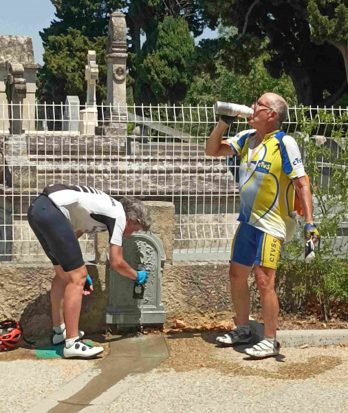 Après un bon petit-déjeuner à l’hôtel, grâce à la présence d’une gardienne de nuit et d’une machine à café, nous démarrons la diagonale le lundi à 5h30. Nous n’avons pas eu de difficultés à l’Hôtel de Police pour le pointage de nos carnets de route et, après le SMS adressé par Pierre à Bernard, nous partons dans la nuit chaude vers l’ouest, puis le nord-ouest, quittant les faubourgs de Perpignan pour franchir le fleuve Têt, puis, par un raccourci, aborder le petit col de la Dona à Pézilla-la-Rivière. Il fait désormais jour et pas encore trop chaud : on supporte nos chasubles dans la montée. On les ôtera plus loin, après la descente sur Estagel. Comme prévu, Pierre mène sur la D117. Malgré l’aspiration, je décroche dès lors que ça grimpe au-dessus de 4-5%, comme c’est le cas avant Saint-Paul-de-Fenouillet. Du coup, je provoque le premier (mais pas le dernier) épisode chronophage : ayant perdu de vue mes compagnons, qui ont poursuivi vers une boulangerie sur la route, j’oblique vers le centre et m’arrête à un bar, d’où je les appelle ! On y prend cafés et « Perrier » (pour Pierre), et on effectue déjà un plein d’eau ! Mais les 20 minutes d’arrêt prévues sont dépassées. Heureusement, jusqu’à l’arrêt suivant, Limoux, du 17km/h est programmé et heureusement dépassé, malgré les 6 km de parfois rude montée vers le col Saint-Louis (FR 11-0696). On avait opté pour ce col inédit pour nous : Pierre avait déjà passé, dans ses précédentes diagonales, le col Campérié, ainsi que ceux de la route des gorges de Galamus (prise également par Sylvie et moi lors de BP 2023). Sylvie et Pierre m’attendent quelques minutes au col, point culminant de la diagonale, puis je reste à une centaine de mètres derrière eux dans la descente, et ils filent sans entendre mes cris lorsque je crève à l’avant dans un virage. Je répare assez vite, changeant de chambre à air et apposant une rustine autocollante à l’intérieur du pneu, usé latéralement par un mauvais positionnement d’un patin de frein, qui a sans doute bougé lors d’une séance de bricolage (suppression du garde-boue cassé) effectuée sur la seconde étape de la flèche ! J’arrête une des très rares auto descendant le col pour demander au conducteur de dire à mes compagnons que tout va bien et que je repars bientôt ! En fait, Pierre avait fait demi-tour et avait déjà bien remonté le col. Sylvie attendait à l’ombre sur la D118, qu’on rejoint après Quillan. On passe Couiza et on avance allègrement sur les faux plats descendants de la vallée de l’Aude, et on est vite à Limoux où on retrouve la supérette du centre-ville, où on avait déjà fait nos emplettes lors de BP de mai 2023. Il est 11 heures, on a donc encore une vingtaine de minutes d’avance. Cependant, le temps de faire des emplettes, de chercher un endroit ombragé pour pique-niquer, et de prendre un café sur la terrasse du bar (où nous n’oublions pas le pointage de nos carnets de route !) situé en face, sur la place où nous étions, et il est déjà plus de midi lorsque nous repartons, avec cette fois une bonne dizaine de minutes de retard sur le planning ! On se dit qu’on les regagnera en escamotant la pause de 30 mn prévue pour déjeuner 25 km plus loin, à Villasavary, puisqu’on vient justement de déjeuner ! En fait, comme on le pressent, on aborde la partie la plus pénible de l’étape, avec un soleil au zénith, une température montant jusqu’à 42° à nos compteurs et, sur la route entre la vallée de d’Aude et le canal du Midi, une succession de bosses plus ou moins longues, mais toujours peu ombragées ! On est évidemment en deçà des moyennes roulées prévues (19, puis 20) et, surtout, on s’arrête régulièrement, 5 à 10 minutes à chaque fois, sous les arbres, pour ne pas trop être en « surchauffe ». Notre entourage, à Pierre et moi, notamment nos conjointes, nous avait d’ailleurs invités à renoncer à cette diagonale, compte-tenu de l’alerte canicule diffusée par les pouvoirs publics. Mais ce n’est pas la première fois que nous roulons sous la chaleur, qu’il convient de « gérer » au mieux. Après avoir croisé, à Prouille-Monastère, la route naguère empruntée sur HM et MH (heureusement qu’on ne grimpe pas aujourd’hui la côte de Fanjeaux : on aperçoit le village tout en haut !), on quitte avant Villasavary la D623, pour rejoindre par des routes communales, la D218, qui nous évite de passer par Castelnaudary. Une fontaine avec robinet d’eau est détectée dans un des villages traversés, ce qui amène évidemment un nouvel arrêt pour boire, pour changer l’eau chaude de nos bidons pour de l’eau qui restera fraiche durant cinq minutes, et pour tremper casquette et gants, qui sècheront vite ! Cette opération est renouvelée à chaque point d’eau, notamment à Avignonet-Lauragais, puis à côté de toilettes nauséabondes, le long du canal du Midi. En effet, après ce dernier village, on a rejoint la fameuse piste du canal, qui a deux gros avantages : éviter la circulation routière et, surtout aujourd’hui, offrir une fraîcheur relative : 36-37° seulement. Il y a cependant quelques inconvénients : la monotonie de certains tronçons, en particulier au nord de Toulouse, un revêtement inégal, favorisant les crevaisons (voir demain…) et limitant la moyenne roulée, et, enfin, le ralentissement et le danger provoqués par d’autres usagers. Ce sera le cas dans la longue traversée de Toulouse, où la piste est même souvent dangereuse, par exemple lors des passages sous les ponts, avec des virages serrés, juste au-dessus du canal ! Sylvie est assez stressée par cette traversée d’agglomération et les slaloms entre cyclistes à vitesses fort diverses, coureurs à pied et piétons ! Les GPS de mes compagnons sont très utiles lors de cette séquence, notamment pour retrouver le départ du tr