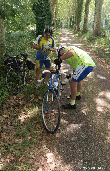 Nous avons avancé l’heure du départ de quinze minutes à cause de la canicule annoncée et nous nous élançons dans la nuit noire. Pas de lune pour nous accompagner. Le terrain est plat et nous progressons bien jusqu’à La Vitarelle, près du Montech. Là, une bosse sérieuse nous ralentit. Bien vite le rythme est repris et à Valence d’Agen c’est la pause petit-déjeuner dans une rue où boulangerie et café se côtoient. A partir de maintenant, le jour levé, nous empruntons le canal latéral à la Garonne. La piste est bonne mais monotone. On ne croise personne, pas d’animaux sur le canal et très vite nous ressentons une lassitude. Bertrand propose de reprendre la D813 parallèle. La circulation s’intensifie à l’approche d’Agen mais permet de nous tenir éveillés. Dans les faubourgs de la ville, nous essayons de reprendre le canal mais la route d’accès est en travaux et nous perdons du temps à tourner autour de bâtiments commerciaux à trouver un autre accès et subitement Sylvie chute dans les graviers et s’écorche bien le genou gauche. Après examen de la plaie, qui saignote lentement, nous repartons et traversons Agen avec l’intention de reprendre la canal près du pont canal. Là, le sariste Serge Polloni, président du CODEP du Lot-et-Garonne, nous attend sur un banc. Nous devisons de nos aventures matinales et il nous accompagne sur plusieurs kilomètres proposant à Sylvie de panser sa plaie au passage chez lui. Mais finalement, comme nous ne sommes pas en avance et que le saignement s’est arrêté nous poursuivons notre route. Je reçois un message de Bernard Ducornetz nous prévenant de son désir de nous rencontrer sur le chemin du canal. Pause pointage, courses et pique-nique à Buzet-sur-Baïse et nous prenons une première partie de notre repas de midi. En effet suite au coup de chaud d’hier après-midi, la digestion a été assez difficile et nous avons préféré moins charger nos estomacs ou en deux fois. La piste le long du canal est bonne, pas trop de branches, ni feuilles, encore trop de racines dépassent à notre goût, mais ombragée. La « fraicheur » est là, 27°, pas plus, ça facilite la progression. Un excès d’optimisme et soudain, une crevaison à l’arrière chez Bertrand. Sylvie, ayant accusé le plus le coup la veille après Limoux, nous propose de poursuivre tranquillement afin de mieux appréhender l’après-midi qui sera chaude. Hier le parcours de l’étape nous a permis de finir sur le canal du Midi et ainsi après le gros coup de chaud passer à l’ombre sous les platanes. Mais aujourd’hui, nous redoutons tous les trois l’après-midi qui se fera sans ombre avec beaucoup de bosses et une température annoncée au-dessus de 40° ! La réparation est longue et nous repartons avec un déficit horaire augmenté. Un peu après, nous croisons Bernard Ducornetz. Lors des discutions engagées avec notre sariste, un problème technique survient sur son vélo. Normalement le sariste nous accompagne et peut aussi nous assister dans nos casses mécaniques, mais là c’est l’inverse. Nous sortons nos outils afin de porter assistance au pédalier qui ne tourne plus rond. La pédale droite semble ne plus tenir. Après trois arrêts et de chères minutes perdues, Bernard nous laisse poursuivre et nous essayons de rattraper Sylvie qui se rapproche de La Réole. A peine sortis de la piste cyclable que déjà la chaleur s’abat sur nous. Nous peinons à trouver un estaminet à La Réole et pris par le temps, nous nous installons sur une place à l’ombre avec des bancs et un robinet d’eau pas trop loin. C’est le moment du deuxième repas de midi. Ensuite, le plein des bidons fait, nous quittons le bourg où Sylvie rechute sans gravité, presque à l’arrêt dans une manœuvre délicate de démarrage en côte. Un passant l’aide à se relever et nous remontons plein Nord vers Barbezieux, un léger vent dans le dos, mais avec des températures au soleil de plus de 40° (max 43°). A Sauveterre-de-Guyenne, Bertrand hésite à regonfler son pneu arrière à la station-service à l’entrée de la ville. C’est bien dommage car lors de la traversée d’une zone de travaux, c’est la deuxième crevaison qui s’avèrera être un pincement. Pendant la réparation à la hauteur d’un garage réalisant des contrôles techniques, j’ahane, je halète, tel le chien la langue pendante, je reste à l’ombre et reprends mes esprits. Je crois que c’est à mon tour d’avoir pris un coup de chaud. Je ne suis pas originaire des pays du Sud, aussi dès que le thermomètre s’emballe, mon métabolisme passe en mode survie. Impossible de faire un effort. Bertrand répare courageusement, Sylvie subit mais résiste et le garagiste nous aide à regonfler la roue avec son compresseur. Il nous propose même de l’eau en bouteille car celle de ses sanitaires est trop chaude. Je reçois un message de Bernard Ducornetz : sa pédale a fini par tomber, il a fait 15km avec une jambe jusqu’à la gare de la Réole où il a pris le train pour rentrer chez lui ! En repartant, Sylvie a une bonne idée : si nous trouvions un hôtel pour nous reposer l’après-midi et plutôt rouler de nuit ? Mais d’hôtel, nous n’en trouvons pas sur notre route et de chambre d’hôtes non plus. Une adresse indiquée sur le web s’avère imprécise et nous force à un arrêt supplémentaire à l’ombre dans le vent. Vent qu’il aurait mieux valu avoir de face comme hier, il nous aurait ventilés. A chaque pause le même processus : boire d’abord en soufflant, laisser le corps perdre la pression, puis s’alimenter doucement de fruits secs salés et de gâteaux. Mais le compteur horaire tourne. Nous nous arrêtons presque toutes les heures et pendant une bonne demi-heure ! Nous avions déjà beaucoup de retard, là avec toutes ces pauses supplémentaires, nous calculons une arrivée bien après 22h. Il n’y aura plus d’accueil à l’hôt