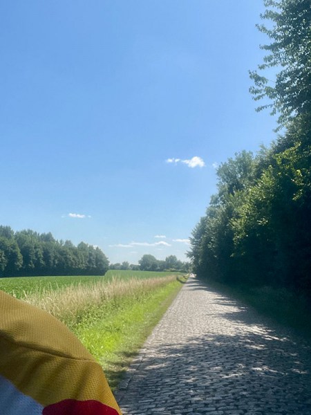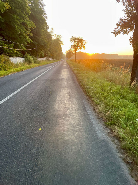 Le 03 juillet à 4h du matin, je prends mon premier départ by-night pour un Sceaux-Bruxelles, ville où j’ai vécu quelques années. Des mois plus tard, les émotions ressenties lors de la traversée de Paris, puis du Val d’Oise familier, vibrent encore en moi. Cette première aube en vélo sur la route de Mortefontaine est à jamais imprimée dans ma mémoire : le ciel bleu, la quiétude des champs, la douce chaleur estivale matinale et la mélodie rythmée de la chaine et de la roue libre… Je chante 🎶 Bicyle, Bicycle, Bicyle, I wan’t to ride my bicyle…🎵! Tout roule et peu avant midi, je déjeune à Saint Quentin, d’une pizza (rassuré par un témoignage récent de David sur Strava à propos de la digestibilité des tomates !). Dans l’après-midi sous un grand soleil après Bavay, les pavés rouges caractéristiques m’indiquent que j’entre en Belgique ! 2km de secousses, mais l’ascenseur émotionnel est au sommet ! Bien sûr, la route est encore longue. À Écaussinnes, je récupère le RAVEL, la piste cyclable pour Bruxelles. L’euphorie et une topographie favorable me rendent moins vigilant : je commets là ma première grosse erreur !