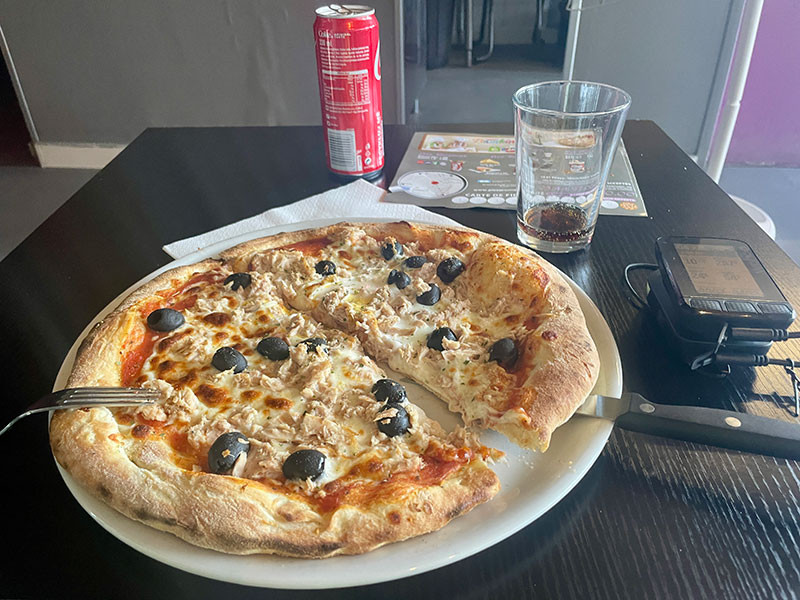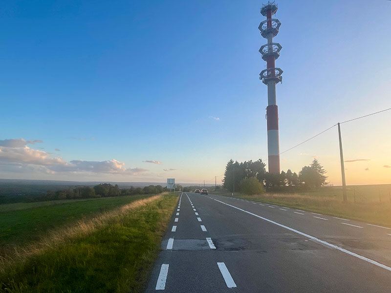 Malgré un hébergement au top, la courte nuit est insuffisante. Et au départ le lendemain à 4h, la fatigue est bien là. Je me focalise sur l’itinéraire, différent pour varier les plaisirs. Quelques frayeurs au sud de Bruxelles (des chemins gravel imprévus, pas adaptés à mes pneus en 23, des travaux…) me font oublier que je suis parti sans… petit déjeuner ! Résultat, après 2h et 40km dont 15 de jolies bosses, je suis sans jus, frissonnant et dois m’arrêter. L’essentiel de mon ravitaillement y passe… Seconde grosse erreur, avoir négligé l’alimentation et les emplettes avant d’arriver la veille. Reparti, je roule jusqu’à la France. Dans Bavay (celle de la veille), je perds du temps pour réunir de quoi me ravitailler. Philosophe, je repars dans un bon rythme… vite stoppé par un passage à niveau fermé pour travaux qui me force à un détour de 10km. C’est démoralisant, car la distance totale du jour monte soudain à 360km. Le doute s’insinue. J’ai oublié de vous dire : le jour 1 totalisait un dénivelé positif de 2200m, mais celui du jour 2 dépasse 2700m… Je m’efforce de me concentrer sur le présent et roule ! Plus tard, en contournant Saint Quentin dans une campagne désertique, le bon rythme est à nouveau interrompu par une cuvaison (crevaison dans un enchainement de cuvettes). En plein soleil méridien, la réparation est pénible, ma cartouche de CO2 n’est pas adaptée. Repartant après avoir insuffisamment gonflé à la pompe à mains, la spirale négative continue son travail de sape. Pourtant, je m’accroche. Mais, les bosses, comme la montée vers la Manufacture des Glaces à Saint Gobain m’épuisent sûrement : les arrêts se multiplient, mal aux jambes, difficulté à boire. À 19h, après 260km, je m’arrête à Pierrefonds où mon père viendra me chercher en auto. Une délicieuse pizza me réconforte en attendant mon chauffeur, et je me surprends de ne pas voir d’échec dans cet abandon. Après tout, je n’avais jamais parcouru seul 610km avec 4500m verticaux en 2 jours !
