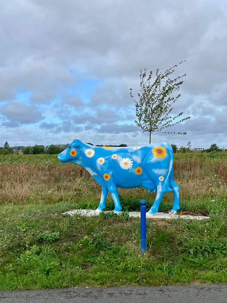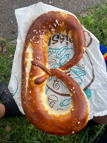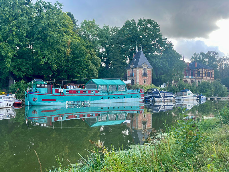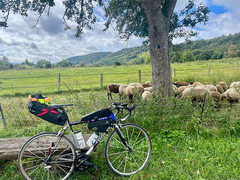 Dimanche, comme sur le Tour, c’est enfin la journée de repos ! Après un seul petit kilomètre d’échauffement, me voilà dans la première montée, courte – 1.5km – mais pentue avec ses passages à 7%. À Grosbliederstrof, un arrêt intuitif dans une boulangerie fréquentée ajoute quelques bretzels à mon panier repas. Journée calme : au programme, longer la Saar, le canal de la Marne au Rhin, passer quelques bosses, parfois sous la pluie, mais le paysage est joli. Je m’autorise un piquenique à base de barres énergétiques (pas terribles) et bretzel (délicieux) à Dossenheim-sur-Zinsel, en compagnie de Shaun le mouton ! Le long du canal, je roule avec Will, un jeune Gallois, qui se rend en Italie pour son premier bikepacking ! Il y a plus fondu que moi !! J’arrive enfin au cœur de Strasbourg, après 133km et 660m verticaux parcourus vraiment tranquillement en 6h30. Il est temps de me rendre à mon hébergement, puis de faire des courses car demain, c’est déjà le retour !