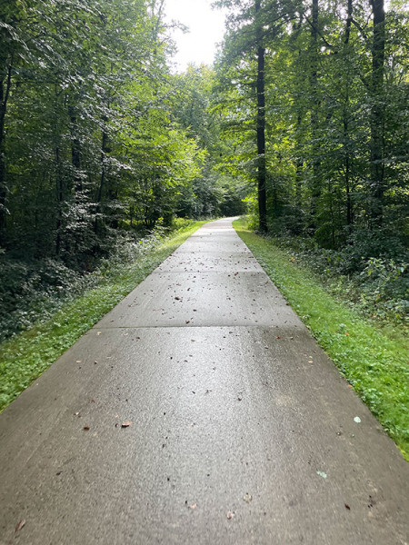 Cette nouvelle étape en montagnes russes ardennaises est LA journée difficile du programme pour mon 23. Fatigué, mais paradoxalement, plus frais que la veille. Probablement les œufs du jardin offerts pour le petit déjeuner ! Échauffement de 10km sur quelques bosses sous la pluie. Puis suivent 5 côtes de 7km à 3.5% de moyenne. Le temps reste maussade et froid « là-haut » et le parcours alterne forêt, côtes et descentes au milieu des champs. Après 3h15 de ce régime, j’atteins la frontière avec le Grand-Duché et je fais enfin une pause chez Stouvenaker, un pâtissier ancien coureur cycliste ! Puis, ça repart via la rue de Belle-Vue avec son passage à 11% ! Après, je traverse le Grand-Duché grâce à la superbe piste cyclable de l’Ater. À Luxembourg, une pause s’impose. Je déjeune de sushi, auxquels je dois certainement mon exploit du jour dans la rue pavée et en épingles des Pruniers, franchissant ses 16% sans mettre pied à terre. Je reprendrai mon souffle pendant quelques minutes quand même… Ensuite, direction la Moselle, que je longe jusqu’à Sehndorf où la trace m’entraine dans les vignes ensoleillées et un nouveau 13%. Je redescends sur les bords de la Saar, mais le temps se gâte et une énorme averse estivale m’arrose avant de remonter à Stiring-Wendel, mon étape. Je la redoutais, c’était vraiment dur par moment, mais cette journée se termine au bout de 226km avec 2300m de dénivelé positif. Ce soir-là, j’avais hâte d’être au lendemain pour pouvoir souffler !