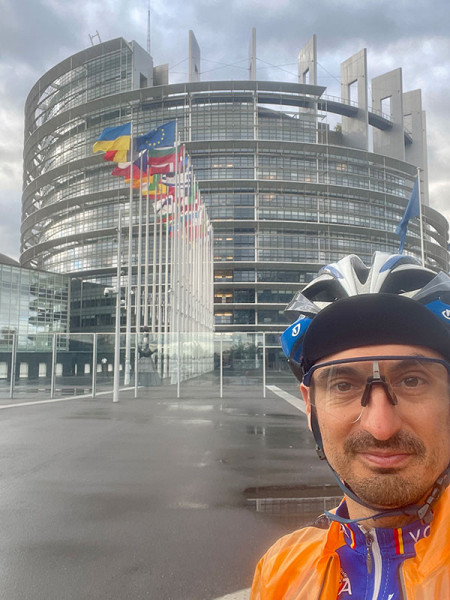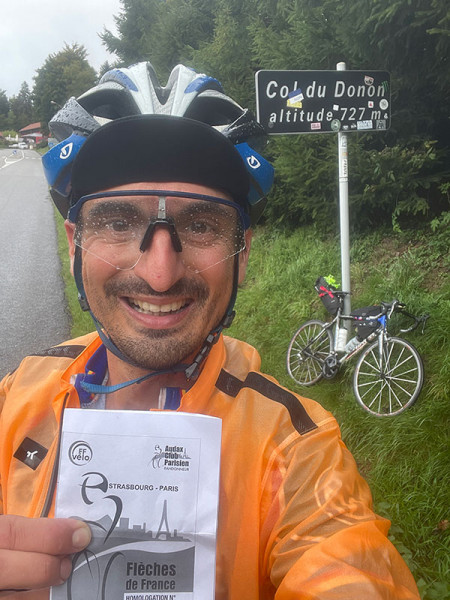 Rien ne sert de courir et je pars à point en ce lundi matin : selfie devant le Parlement, puis arrêt chez un vélociste pour vérifier ma chaîne. Il me déconseille l’huile de table… Note pour plus tard : prendre une burette de lubrifiant ! Quelques courses, puis je prends le départ de ma seconde Flèche de France pour Paris à 10h40. La sortie de Strasbourg est mal aisée en raison de travaux d’aménagement et de la pluie qui s’invite. J’ai appris à enfiler ma veste pluie en pédalant mais… j’avais décidé qu’il était inutile d’enfiler mes surchaussures ! Juste avant le déluge, le perron de l’église de Wolfisheim m’abrite pour cette opération nécessitant de quitter ses chaussures. J’ai bien fait, les conditions seront mauvaises un bout de temps. Heureusement, le parcours est « roulant ». Mais à partir d’Obernai, j’attaque l’ascension du Col du Donon qui se fait en 2 temps : d’abord 20km jusqu’à Grendelbruch, puis 10km de Schirmeck au sommet du Col. Une prochaine fois, j’irai voir le temple là-haut ! Sur le papier suivent ensuite 60km descendants. Mais, je n’avance pas ! La route et les conditions sont mauvaises ; le vent de face ne cesse de me freiner. Je suis trempé et transi de froid ! D’ailleurs, je m’arrête dans un abri bus à la Trouche, où j’arrive au bout du rouleau. Restauré et changé, je repars pour… 16km seulement, victime d’une crevaillon (crevaison liée à gravillon frais) alors que j’attaque le raide « chemin de la Creuse » ! Heureusement, je peux gravir l’essentiel, avant de remplacer la chambre et utiliser, sous l’œil admiratif d’un spectateur inopiné, ma mini pompe électrique. Testée auparavant ! 20min plus tard, je repars pour les 65km derniers kilomètres du jour, assez peu roulants. J’ai le réflexe de m’arrêter faire des courses à Vézelise, juste avant la fermeture du G20. L’arrivée à l’étape à lieu à la nuit tombée à Favières vers 20h, un peu en avance sur l’horaire prévu. Repas et repos bien mérités après ces 179km et 1880m de dénivelé positif. Et Weather Impact m’indique que j’ai eu du vent de face 90% du parcours. Je comprends mieux ma fatigue et décide de décaler mon départ à 5h le lendemain.
