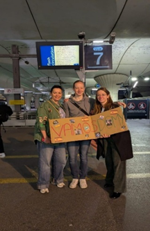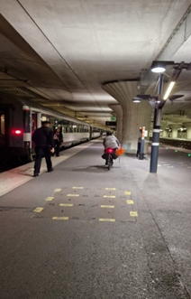 Rien n’est jamais perdu, je repars avec mon vélo qui ronronne, j’arrive à la gare pile à l’heure du départ du train. Et là, SURPRISE: 3 copines du CTVS venues m’encourager avec des panneaux et un délicieux flan. Pas le temps de parler avec elles qui m’attendent pourtant depuis 2 heures, le chef de gare m’ordonne de remonter sur mon vélo pour aller jusqu’à ma voiture (alors que c’est interdit) et embarquer au plus vite !