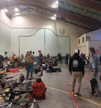 Le départ est à minuit dans la nuit du vendredi à samedi à Hasparren, mais il faut y être au moins 2 heures avant. J’y arrive vers 20h, l’attente est un peu longue dans ce gymnase ou certains essaient de dormir, une DJ est aux platines mais personne ne danse. 40% de femmes, ça change des autres épreuves longues distances. Je croise des têtes connues, Camille, Anais, Mauve…, fait la connaissance d’autres comme Yannick et Enora : les discussions portent souvent sur la route du départ : il y a 2 cols possibles ou la route de la côte, plus longue et très ventée.
