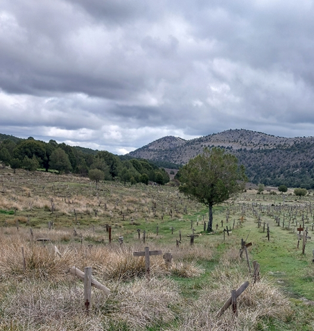 Celui-ci est à Sad Hill, un cimetière bizarre, celui du film « le bon, la brute et le truand », après quelques kilomètres de gravel. En bas de la colline je trouve un restaurant ouvert, il doit être 14h, j’ai faim, mais je n’arrive pas à manger beaucoup. J’y retrouve Sybile et ses copains, dont c’est la dernière étape car ils rejoignent Madrid[OL1] . Je repars avec eux sur quelques kilomètres.; j’aurai bien voulu trouver des cafés ou pâtisseries ouverts, mais en ce dimanche de Pâques, tout est fermé. L’après-midi est bien agréable, bien ensoleillé avant une averse en soirée.