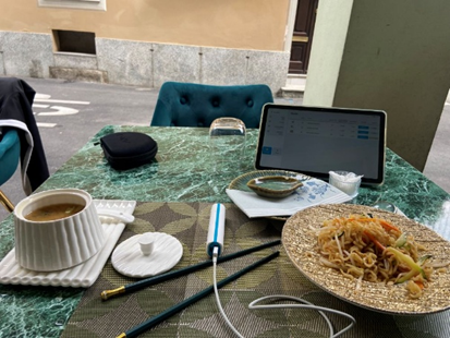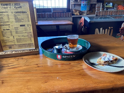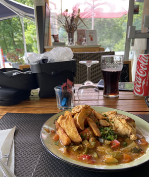 Les instructions me sont données, le petit dej déjà installé. Impec, je suis autonome, je peux partir en quête de mon dîner. Oui il y a de nombreux restos autour de chez nous me disent mes hôtes. Sauf que nous sommes lundi; le micro centre-ville est mort. Sur six restos, un seul ouvert et complet. Aïe Je googlemap, et trouve une brasserie avec terrasse où je retrouve Peter, Mathias et Walter, ils n’ont pas encore commandé. Ils m’invitent à leur table. Dîner rapide et efficace, on échange, on est bien, chacun sur son tel.