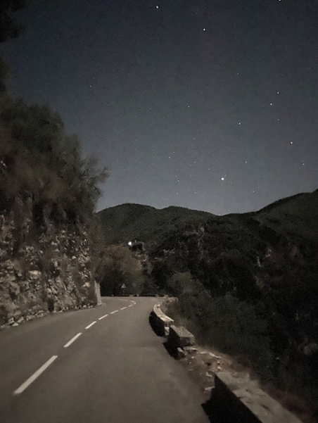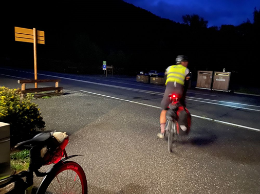 Bigre, le con. Rien de méchant, juste un rappel de vigilance et micro bobo au coude. bien bien bien. Pendant que je me remets les idées en place, un cyclo passe dans la nuit.