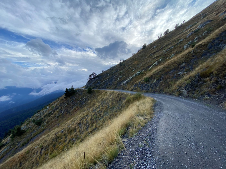Un tantinet moins aérien, je finis par me hisser au col de Sestriere (IT-TO-2024), après 11 km de montée pour environ 680 m d’élévation depuis la vallée de la Doire Ripaire. Après les quatre cols d’hier, voilà un cinquième « plus de 2000 », permettant la validation d’une centaine de cols ! L’expédition est d’ores et déjà en partie réussie ! L’absence de cales aux pédales et le sac à dos ne favorisent guère la vitesse, qui oscillait entre 5 et 8 km /h. Je cherche un point d’eau dans la station quasi déserte, et je trouve une belle fontaine sur ma route, permettant de bien boire et de faire le plein du bidon et de la bouteille qui leste le sac à dos : il n’y aura plus de sources sur la piste de l’Assietta. Grâce à un repérage préalable sur internet, je trouve sans problème son commencement : il faut quitter Sestriere, puis remonter à gauche en lisière de l’Est de la station, avant de prendre à droite la SP 173. Les premiers hectomètres redescendant vers un pont sont encore bitumés, puis c’est la piste, de plus en plus médiocre. En 6 km et environ 400 m d’élévation, on arrive au col Basset (IT-TO-2424), après être passé au Colletto di Costa Treceira que je pensais comptabiliser, à tort, comme je m’en apercevrai au retour dans le Var : cet endroit ne figure pas dans la liste des cols du CCC ! La montée a été pénible, et j’ai dû marcher trois ou quatre fois sur de courts secteurs trop raides et caillouteux. Les effets de l’altitude se font un peu sentir ! En haut, j’effectue une pause assez rapide pour m’alimenter, comme je le ferai à plusieurs reprises, alternant le salé (chips, cacahuètes…) et le sucré (lait concentré, canette de Gerlinéa, madeleines, bananes, pâte d’amande, chocolat…). Après une petite descente, voici enfin quelques hectomètres de plat ou de faux-plat, avec une piste un peu meilleure et, au bout de 3 km, le col Bourget (IT-To-2299a).