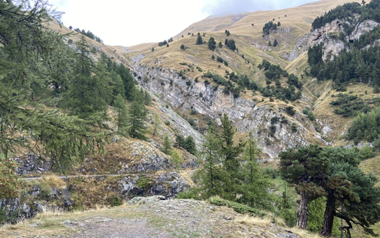 Partant du Var le jeudi 11 septembre, j’arrivais en début d’après-midi dans les lacets de la route menant à la station de ski de Risoul, au-dessus de Guillestre et laissais la voiture à environ deux kilomètres du bourg. Après être monté jusqu’à celui-ci, à 1800 m d’altitude, je finis, grâce aux renseignements de gardes forestiers en 4X4 (j’ai un compteur Bryton, mais je n’ai pas su activer sa fonction GPS), par trouver la piste menant au col de Chérine (FR-05-2270). Elle était à peu près cyclable et je n’ai eu à monter à pied qu’à deux ou trois reprises, dans des parties trop caillouteuses ou en dévers. Une fois au col, je descends en sens inverse sur quelques centaines de mètres et remonte sur une piste, à droite, qui part vers le S-E. Après environ 1,5 km, c’est le passage du col de Valbelle (altitude 2372), puis, après la même distance, on franchit le col du Vallon (FR-05-2466b). Enfin, après une hésitation et un demi-tour, je trouve la piste qui passe dans un petit tunnel pour redescendre légèrement, sur moins de 500 mètres, sur le col des Saluces, à 2444 mètres d’altitude. Les remontées mécaniques sont nombreuses sur cette crête, avec au Nord le domaine de Risoul et à l’Est celui de Vars. Après les pluies récentes, un doux soleil de fin d’été est revenu. Au col des Saluces, je contemple la vue vers la vallée de la Durance, à l’ouest, puis fais demi-tour. La descente vers Risoul se fait sans difficultés. Les freins font un boucan épouvantable, avec l’avantage de signaler mon arrivée, mais il n’y a pas grand monde sur la piste (mais j’apercevrai, au cours de ces trois jours, des marmottes aux alentours) et dans la station en cette fin de saison. De retour à la voiture, après 21 km et 805 m de D+, à une moyenne roulée de 8,5 km/h, je pars vers Briançon, où l’hôtel « Interhôtel » m’accueille. C’est un établissement un peu vieillot, mais d’un excellent rapport « qualité-prix ».