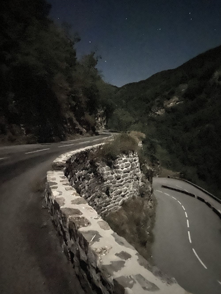 Tout est mouillé. Nuit sombre, très nuageuse ; la lune est absente. J’ai évité la pluie. Pensée pour les randonneurs nocturnes qui ont probablement dû s’abriter.