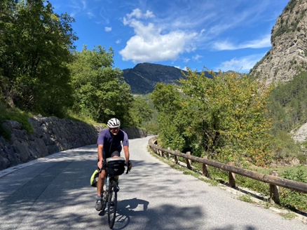 En conséquence, je pris, en voiture, la direction du Briançonnais, avec dans le coffre un vieux VTT de marque Orbéa, âgé de plus de trente ans, avec lequel j’ai beaucoup roulé avec mon fils, et un peu moins désormais avec mes petits-enfants. Il est évidemment doté de freins à patins, et de pédales simples, nécessitant l’utilisation de baskets, ce qui a l’avantage de pouvoir mettre pied à terre sans risque de chute dans les passages périlleux, en montée comme en descente. L’engin n’est guère fiable, avec notamment un dérailleur faussé du fait d’une chute il y a une vingtaine d’années. La selle est un peu fendue et j’ai fixé d’épais plastiques sur les poignées du guidon, dont le caoutchouc est fondu. Le pédalier a un jeu significatif et, par moments, un bruitage inquiétant. Ce VTT n’a d’ailleurs jamais vu un vélociste ! Cependant, j’ai changé les pneus il y a une dizaine d’années et bien graissé la chaine avant le départ ! Il est évident que, si je ne roulais pas en solo, je ne prendrais pas un tel engin, au risque de retarder mes compagnons en cas de défaillance matérielle !